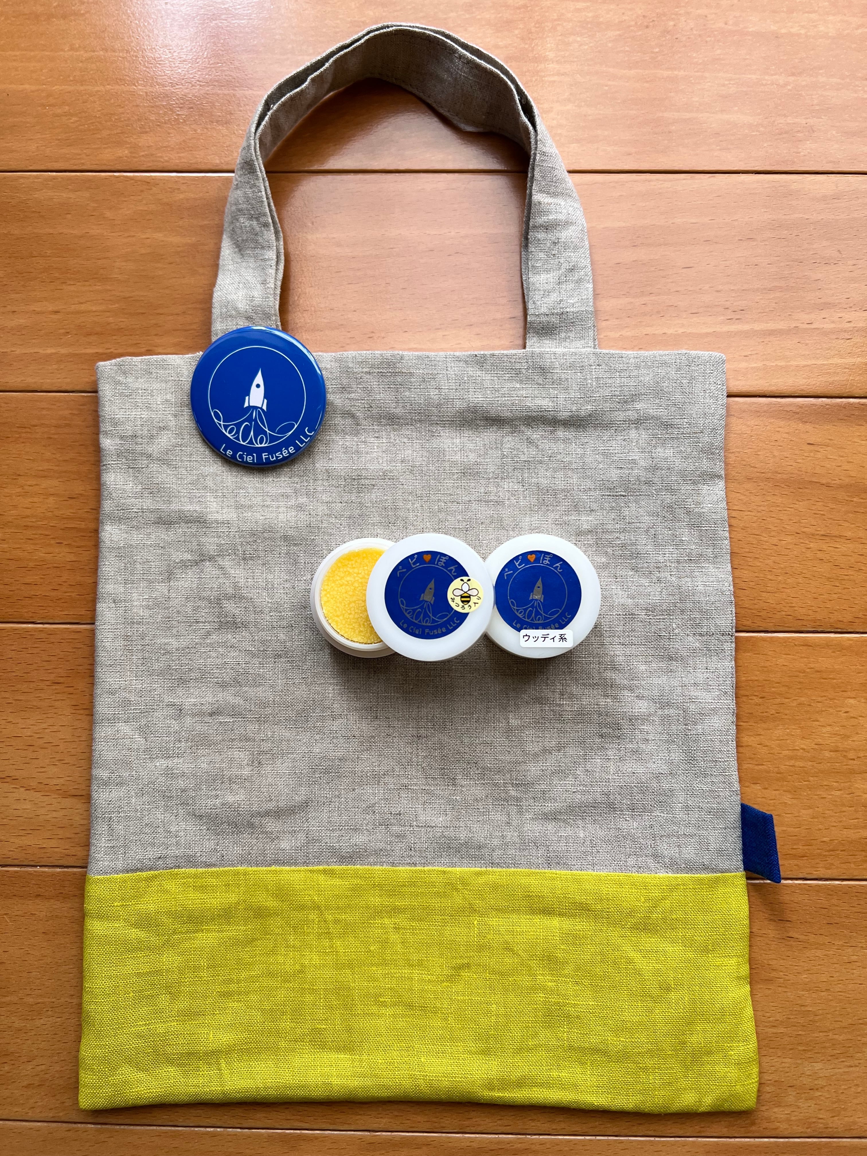 お手製、布バックポメロカラー丁寧に縫製仕上げしております。ルシエルフュゼオリジナル缶バッジお付けして数量限定